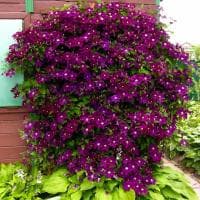 Тогда без помощи клематиса Варшавска Никэ вам точно не обойтись! Как только зацветает эта лиана, зеленые листья становятся практически не видны. На первый план выходят огромные бутоны, диаметр которых достигает 17 см. Темные пурпурно-фиолетовые краски лепестков отлично дополняют золотистые тычинки.